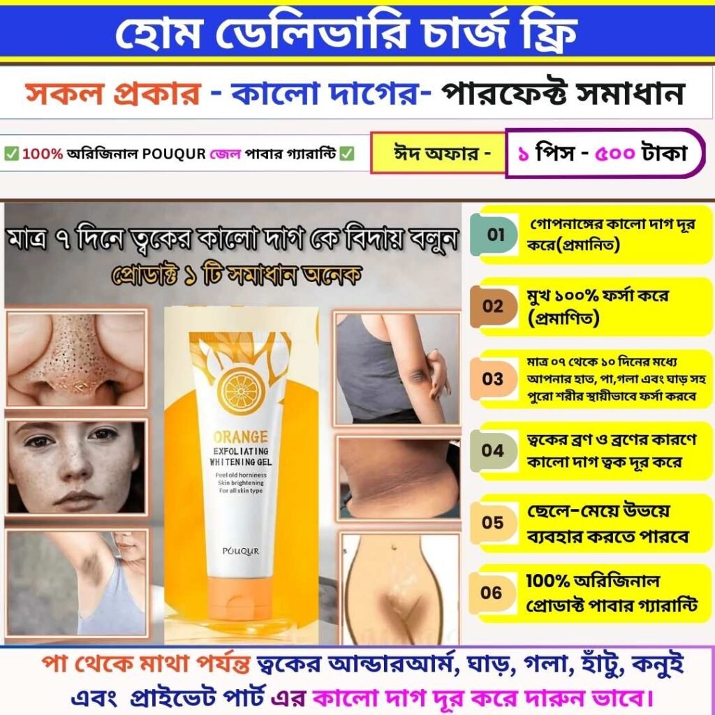 POUQUR Orange Exfoliating Whitening gel – আমরা সরাসরি চায়না থেকে প্রোডাক্ট ইমপোর্ট করেছি ——— কেন ব্যবহার করবেন? গোপনাঙ্গের কালো দাগ দূর করে(প্রমানিত) মুখ ১০০% ফর্সা করে (প্রমাণিত) যে কোন কালো দাগ দূর করবে ত্বকের যে কোন দাগ দূর করে ত্বক দ্বিগুন উজ্জ্বল ও ফর্সা করে প্রাকৃতিক উপাদান ও ফ্রুটস দিয়ে তৈরী একনি ও ব্যাকটেরিয়া রিমূভ করে ছেলে-মেয়ে উভয়ই ব্যবহার করতে পারবেন এলার্জির কোনো সমস্যা হবে না — 100% অরিজিনাল প্রোডাক্ট পাবার গ্যারান্টি 100% অরজিনাল POUQUR পাচ্ছেন -একমাত্র আমাদের পেইজে
